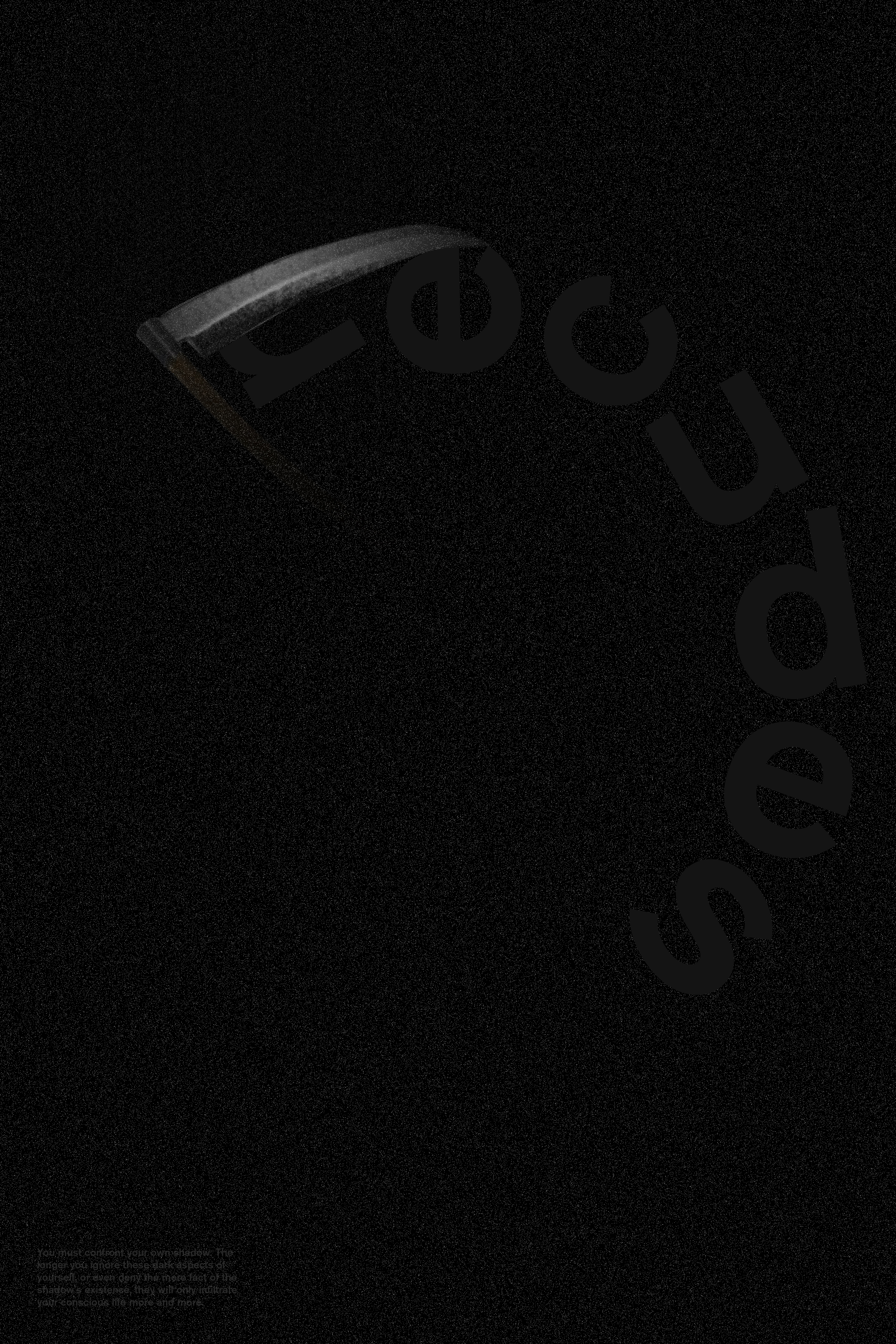 These posters stretch the notion of the object poster by hiding the objects more than displaying them, alluding to a larger theme of C.G. Jung’s shadow archetypes. “Trickster” refers to Hermes, “shapeshifter” refers to the Joker, and “seducer” refers to the death figure. The darkness catches your eye from afar, as do the objects almost fully submerged into a grainy shadow, and then the vinyl-cut sans serif letters carefully placed on matte paper ever so slightly glint in the light. These factors draw you in closer to examine the posters and ultimately find the small body text on each that go further into the shadow self and archetypes. I made them for my Poster class for the “object poster” unit senior year.